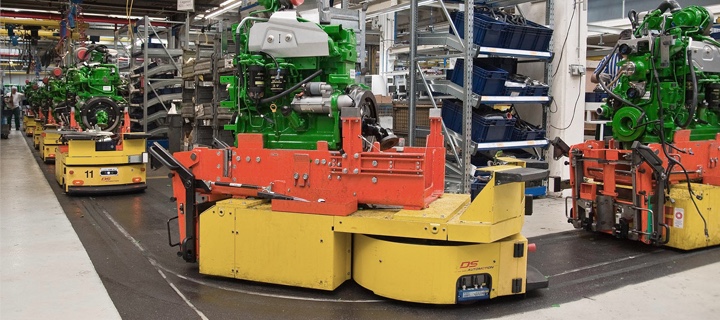 DS AUTOMOTION setzt bei seinen Fahrerlosen Transportsystemen (FTS) das neue Traktionsantriebsystem (TAS) von WITTENSTEIN ein. Fahrerlose Transportsysteme (FTS) werden innerhalb von Betrieben eingesetzt, um Waren und Material von A nach B zu bringen. Scheinbar wie von selbst finden sie ihre Wege, weichen Hindernissen aus und fahren vorwärts, rückwärts und sogar seitwärts. Die Gesamtlast dieser Fahrzeuge liegt bei 2,8 Tonnen. Bewegt werden die FTS mittels elektrischer Antriebe.