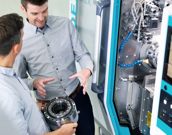 In Sachen Maschinenkonzept, Arbeitsraum, Footprint, Stückzeiten und Zerspanungsqualität besitzt die weiterentwickelte INDEX ABC alle Leistungsmerkmale der mehr als 3.000-mal verkauften Vorgängerversion. Revolutionär ist allerdings der neue obere Revolver, in dem das Galaxie® verbaut ist. Er ist der Grund, warum der CNC-Drehautomat vielseitige neue Bearbeitungsmöglichkeiten bietet und so das bearbeitbare Teilespektrum massiv erweitert. Dieser Performancesprung wurde möglich, weil es den INDEX-Ingenieuren in Zusammenarbeit mit den Experten von WITTENSTEIN galaxie gelungen ist, die bisherige Revolver-Technologie aus starrer Hirth-Verzahnung und hydraulischer Klemmvorrichtung durch ein einziges Hochleistungsgetriebe zu ersetzen: das kompakte Galaxie® GS 190 aus der neuen Baureihe Galaxie® accuracy line mit optimiertem, integriertem Lagerkonzept für bestmögliche Ruhewerte.