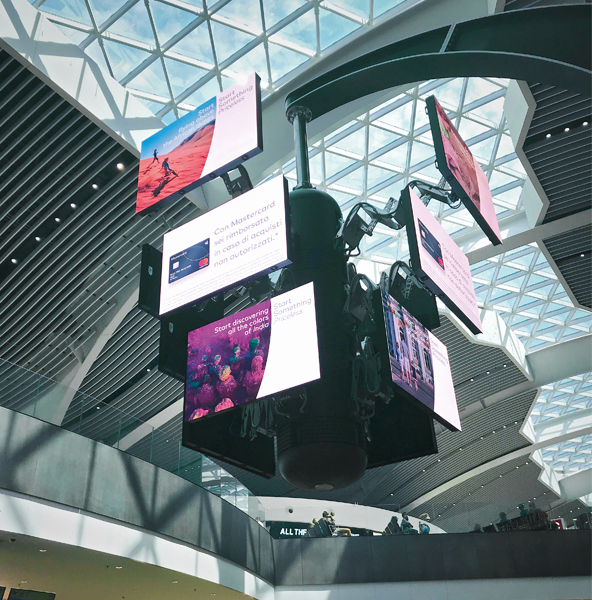 “Le Chandelier” – der Kronleuchter – So nennt der italienische Betreiber das von der Simtec Systems GmbH aus Braunschweig stammende Werbesystem ScreenFLITE®. Wie von Geisterhand werden die zwölf Bildschirme mit ihrer Gesamtfläche von 24 m² auf drei Rotationsebenen immer wieder für neue Werbebotschaften miteinander kombiniert.